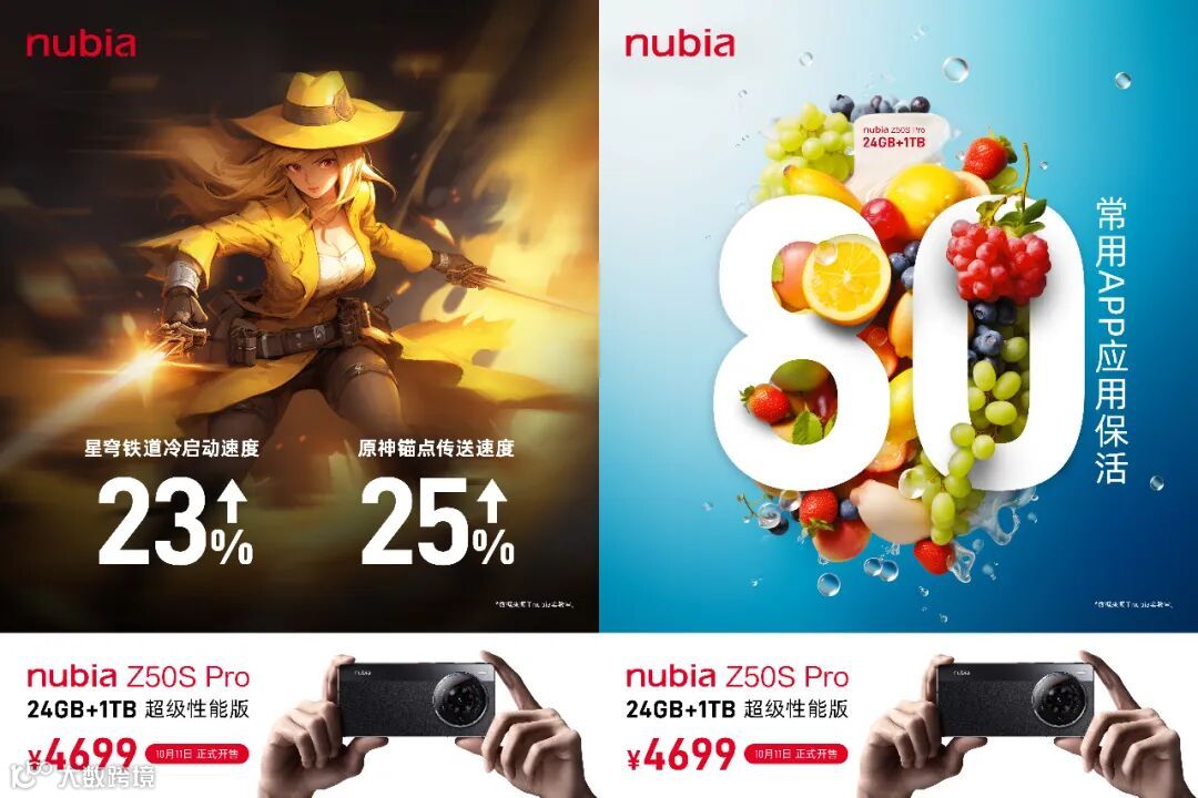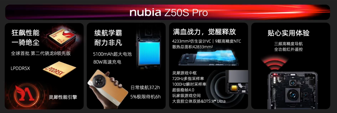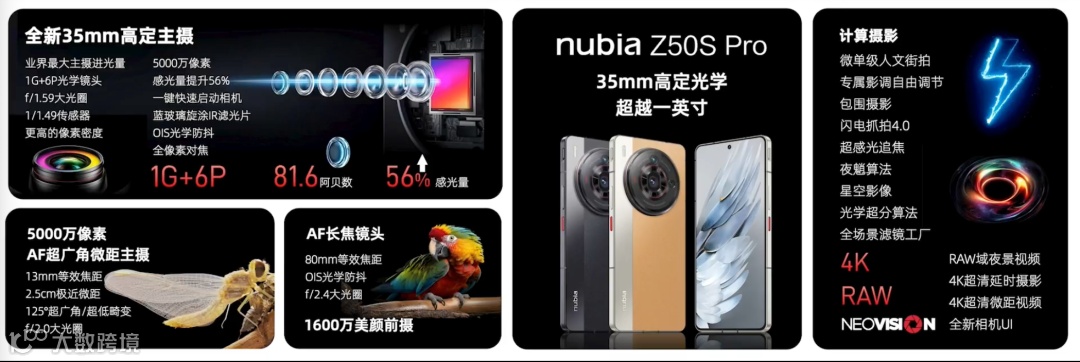 作为补充,努比亚Z50S Pro发布于今年7月,主要配置有:6.78英寸1.5K居中单孔AMOLED京东方Q9柔性直屏,120Hz刷新率,2160Hz PWM高频调光,屏下指纹,直角中框,侧边有滑动功能键,前置16MP,主打35mm定制光学系统,后置三摄50MP主摄 有OIS(1G+6P 35mm)+50MP超广角微距+8MP长焦 有OIS,搭载骁龙8 Gen2领先版,5100mAh、80W有线充,配备X轴马达、双扬、红外、NFC、USB 3.1 Gen1等。24GB+1TB 4699元你觉得如何?