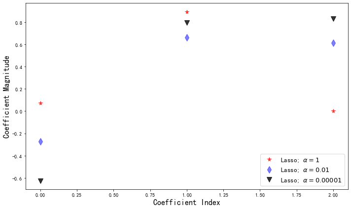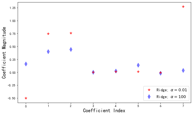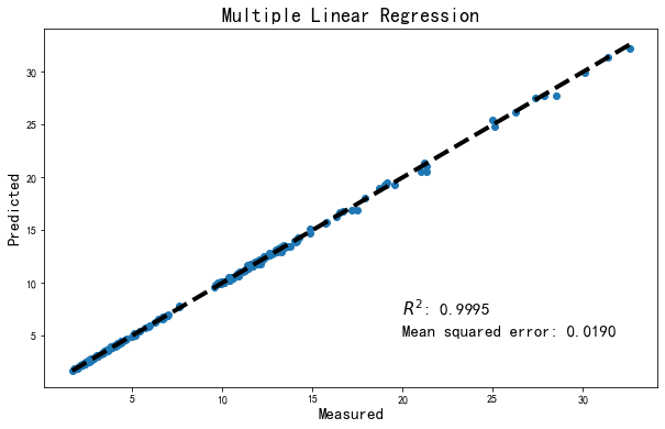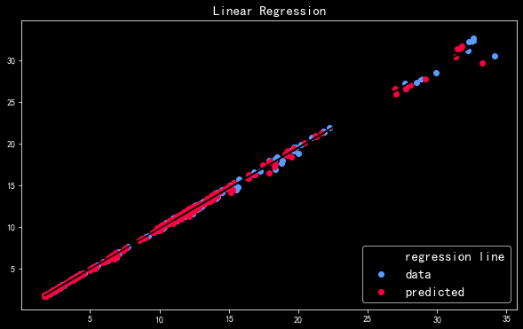另外将真实值与预测值比较,检查回归的拟合效果。可以看出真实值(蓝色点)与预测值红色点)几乎是重合的,因此此时模型拟合效果非常棒。