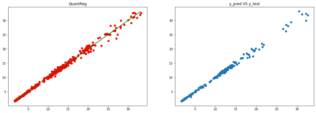 分位数回归真实值与拟合直线(左图),及预测值与真实值散点图(右图),从两张图可以看出模型拟合效果还是不错的。