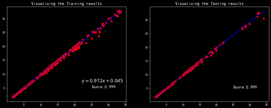 模型在测试集(右图)与训练集(左图)上的真实值与预测线性模型的可视化。线性模型方程为 。
