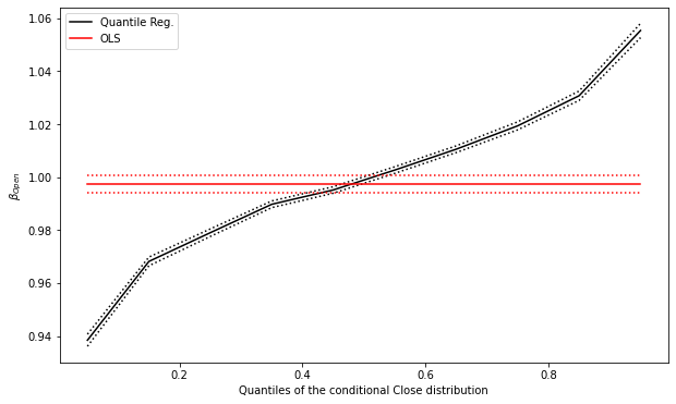 上述分位数回归的结果说明,在收盘价分布的不同位置(不同分位数),开盘价对其的影响是不同的。下图展示了这一点。