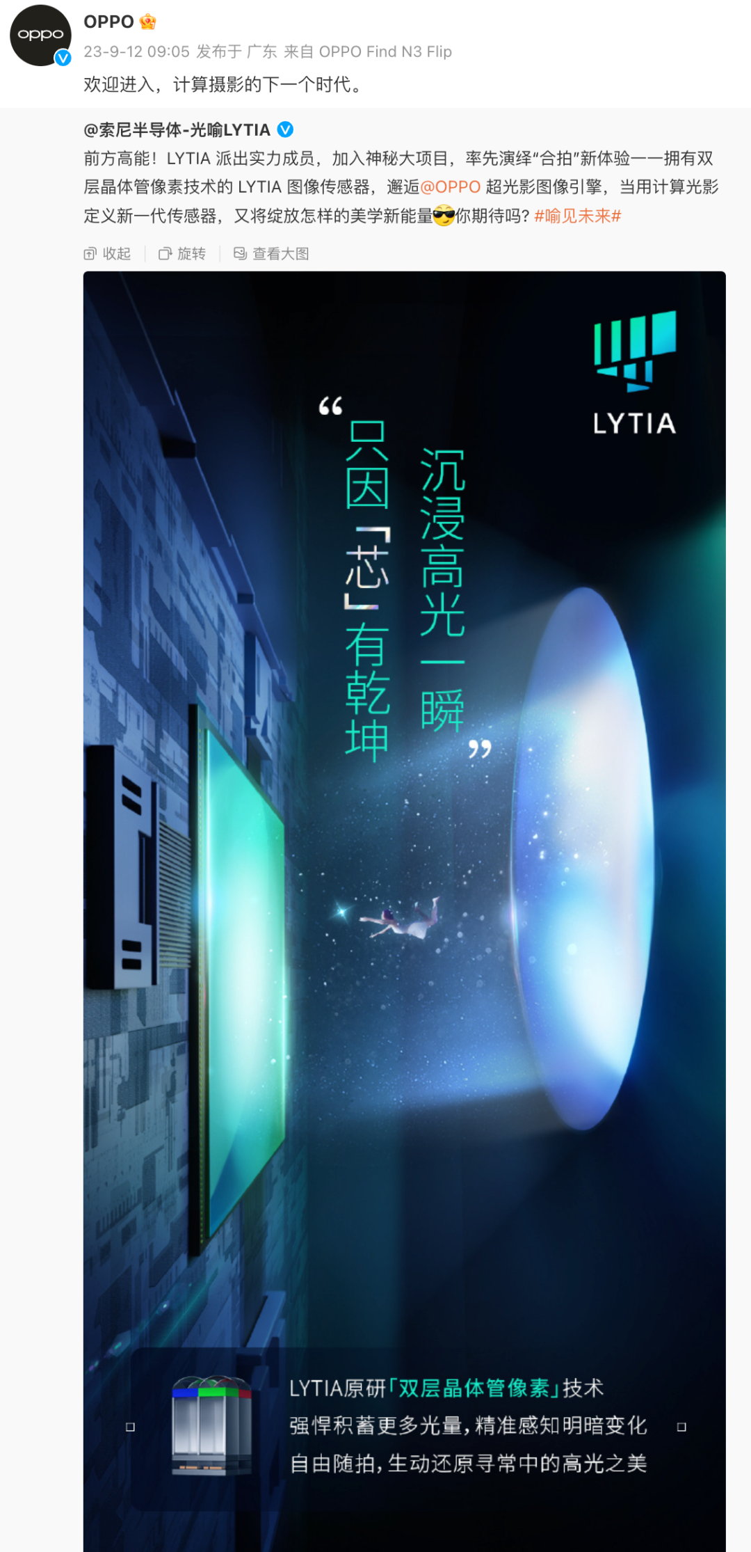 今天OPPO和索尼联合预热了新一代LYTIA图像传感器。