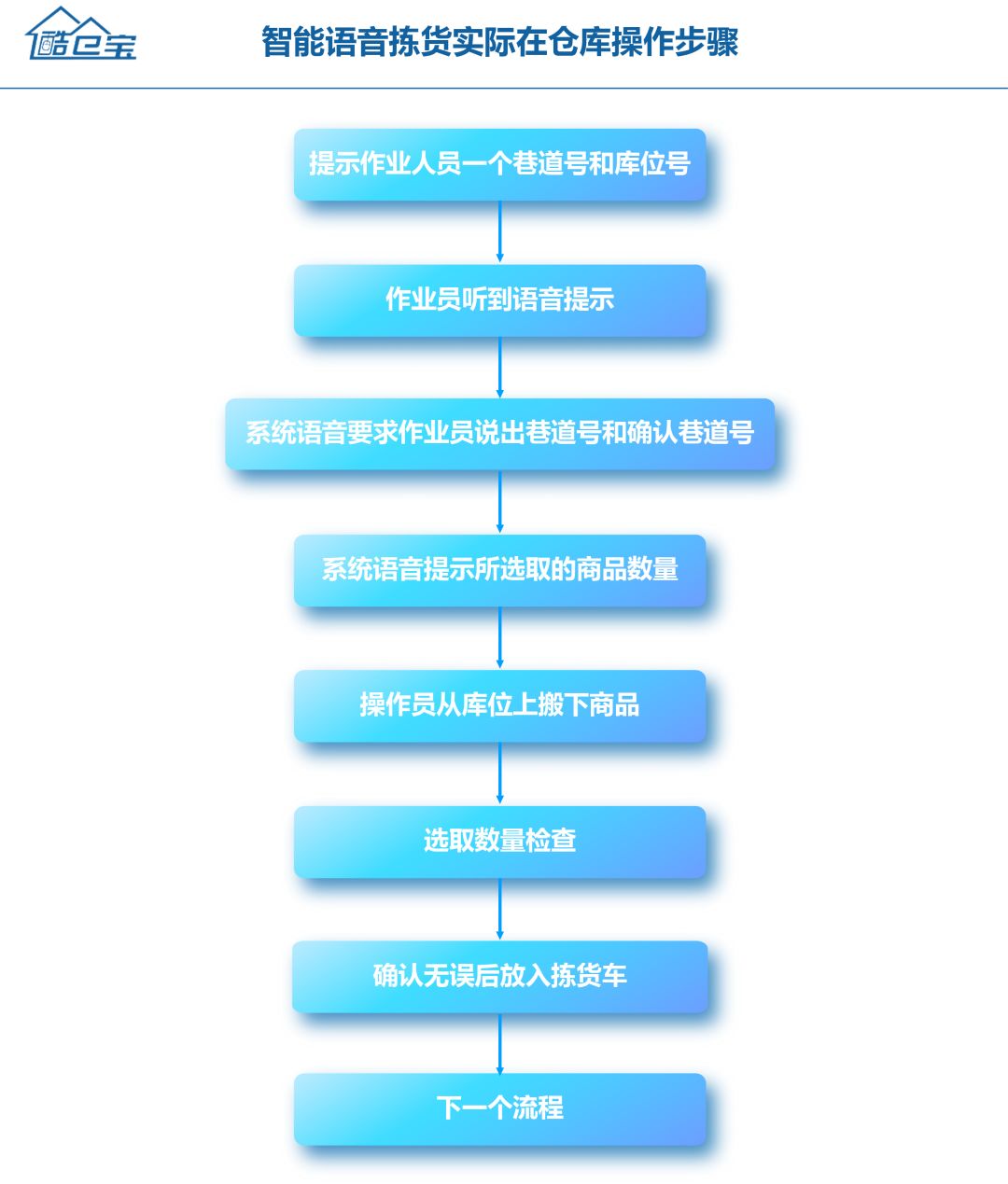 智能语音拣货在仓库操作简单,作业员只需听取指令执行操作。首先语音拣选系统提示作业人员一个巷道号和库位号,作业员走到相应的巷到号和库位后,用语音和系统确认巷道号和库位确认都无误后进入第二步。系统语音提示操作员读出商品条码,确认无误后,系统语音提示所选取的商品数量。进入第三步,操作员从库位上搬下商品,选取商品数量和系统确认无误后放入拣货车进入下一个流程或执行下一个任务。