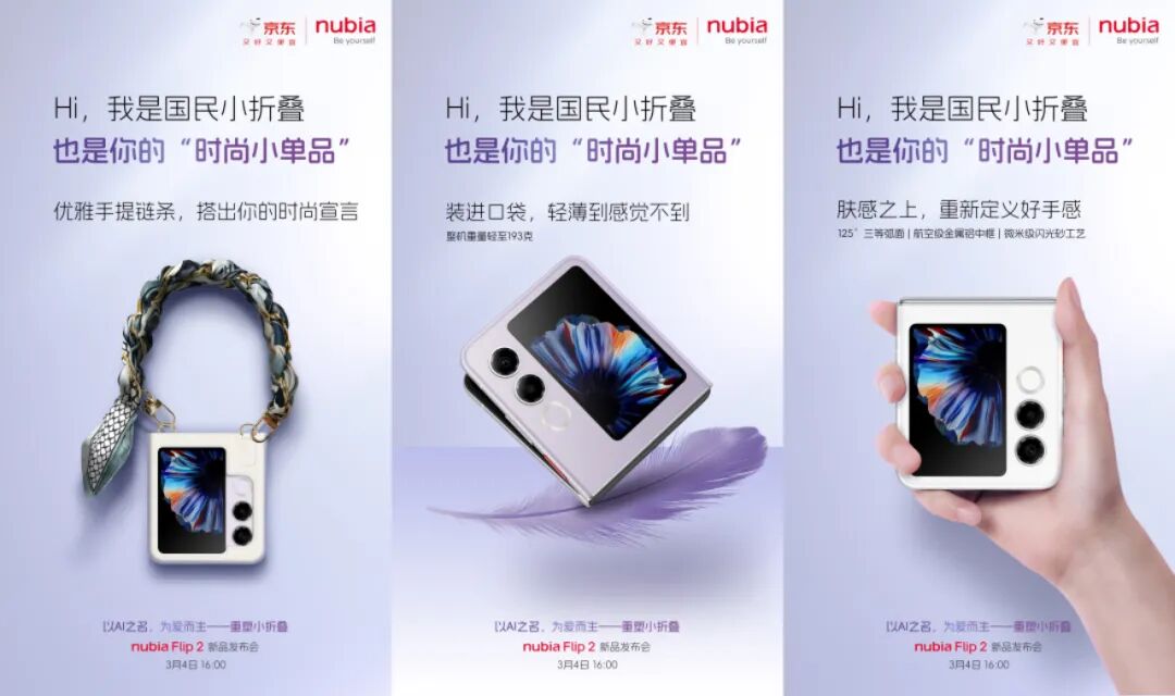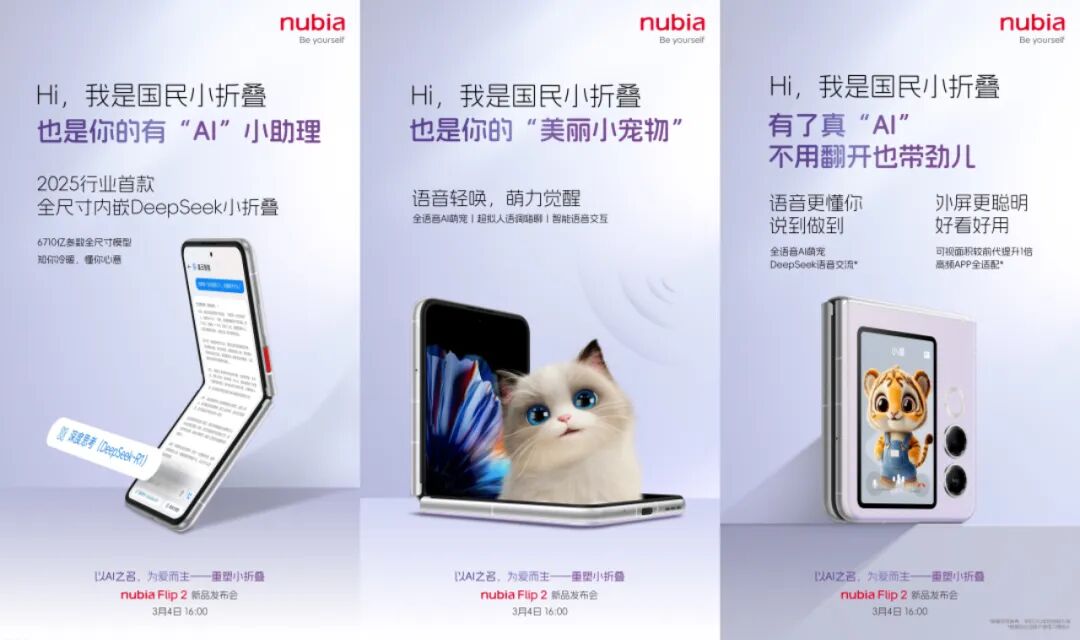 如上图所见,官方预热努比亚Flip2将在3月4日16点发布,依然主打“国民小折叠”,同时还将配备全语音AI萌宠、全尺寸内嵌DeepSeek、全方位轻薄抗摔、全视角悬停摄影等等。
