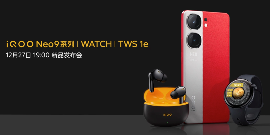 iQOO Neo9系列官宣将于12月27日19点发布,目前已经上架开启预约,官方表示届时将带来iQOO Neo9、iQOO Neo9 Pro、iQOO首款智能手表iQOO WATCH以及iQOO TWS 1e耳机、iQOO散热背夹2等多款新品。