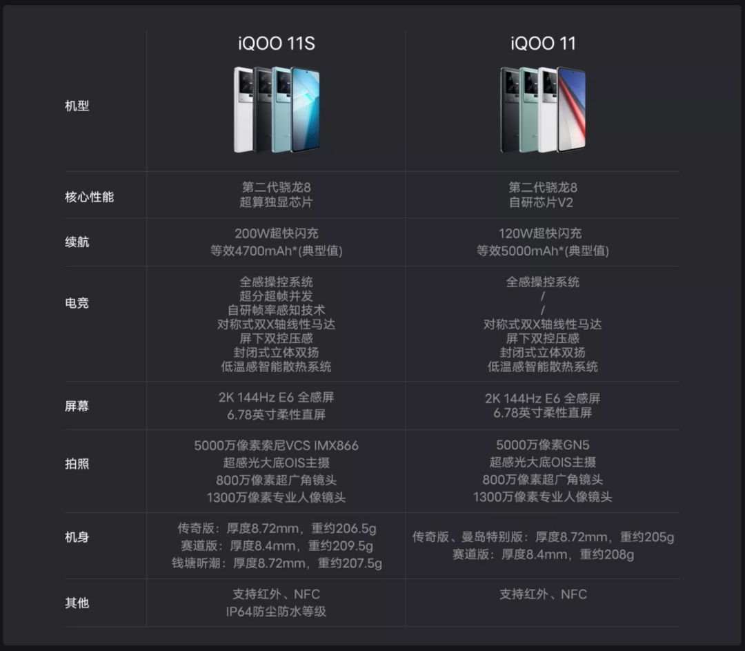 上图为去年12月发布的iQOO11和7月发布的iQOO11S