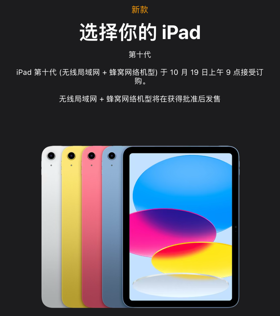 具体iPad 10无线局域网+蜂窝网络机型首次支持eSIM,64GB版售价4799元,256GB版本售价5999元,将于10月19日起接受预订,10月25日起正式发售。这也是中国大陆发售的iPad首次支持eSIM,不过目前仅中国联通的特定套餐才行。