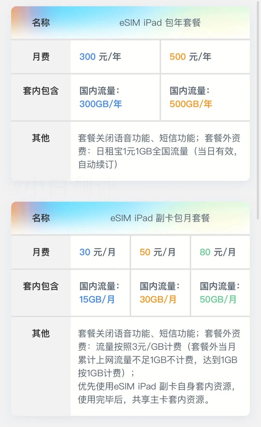 中国联通也在eSIM专区上线了相关的iPad套餐,具体联通eSIM详细资费见上图,iPad包年最低300元/年(300G流量),副卡包月最低30元/月(15G流量)。不知道大家觉得这价格怎么样?