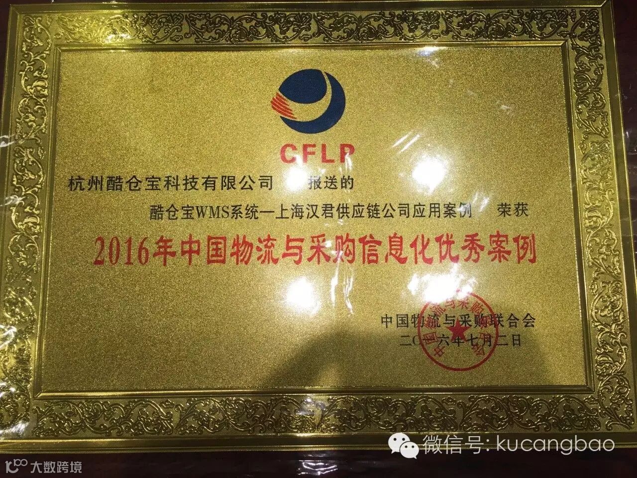 2016(第八届)中国物流信息化大会于7月2-3日在长春宴都大酒店隆重举行。本次会议以“平台经济下,物流产业的智慧联接与融合”为主题,在中国物流企业优秀案例中,对在开发、应用和管理创新中取得突出成果的企业进行了表彰,杭州酷仓宝科技有限公司报送的《酷仓宝WMS系统--上海汉君供应链公司应用案例》荣获“2016年中国物流与采购信息化优秀案例”大奖,酷仓宝CEO王鑫博士代表公司上台领奖。
