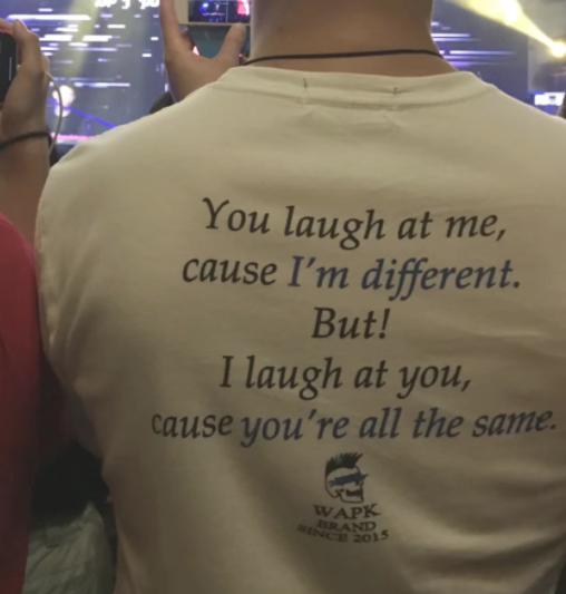 虽然穿带 Slogan 的衣服不是什么稀奇事,但生活中,我们总会因为看到一些人衣服上的 Slogan 而忍不住笑出声……