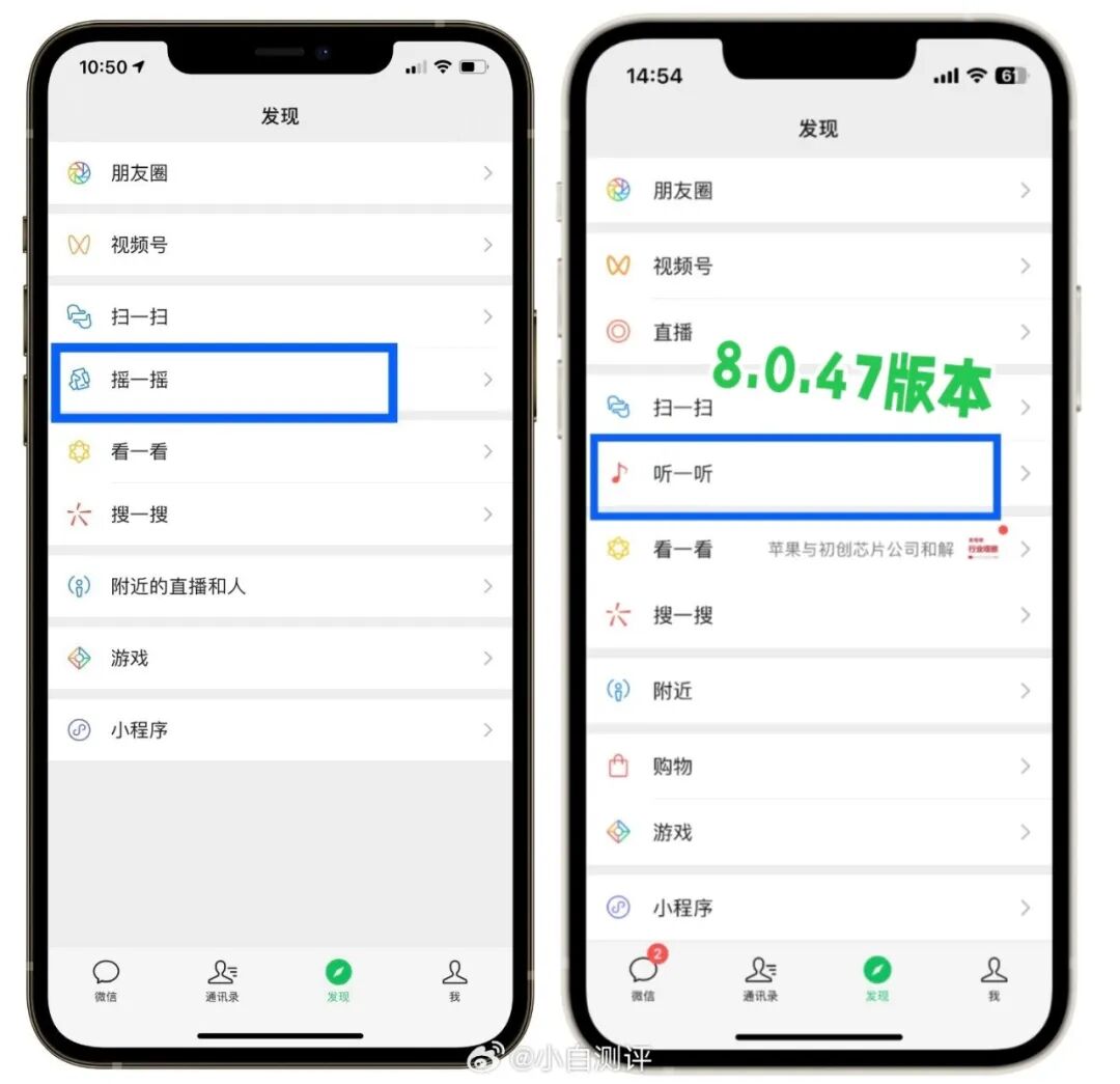 如上图所见,8.0.47版本下,微信发现页不再看到“摇一摇”,新增“听一听”界面。