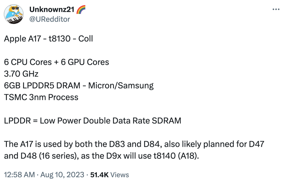 与此同时,另一位爆料达人Unknown21还披露了苹果A17的详细规格:采用台积电3nm工艺制程,6核CPU+6核GPU,主频最高3.7GHz,并透露iPhone 15 Pro系列运存规格或为6GB LPDDR5,并非之前外界猜测的8GB内存。就目前iPhone 13 Pro系列、iPhone 14全系使用情况来说,感觉苹果6GB内存已经不堪用了,国产安卓已经要卷到24GB了,希望苹果也能有所提升吧。