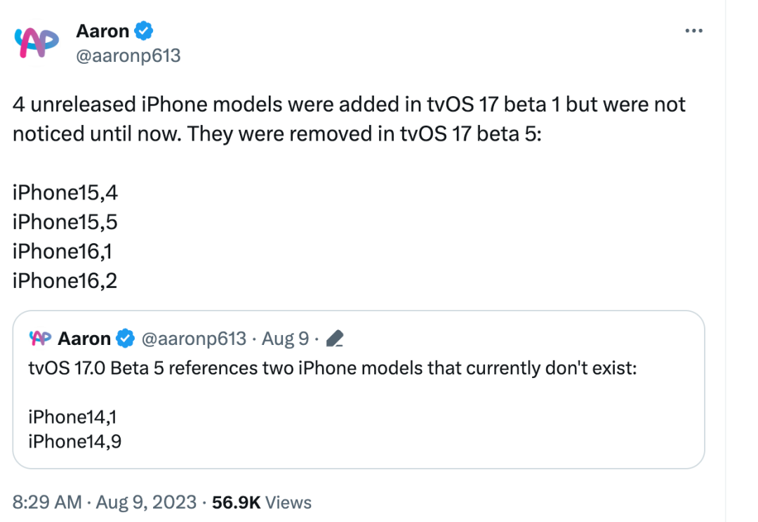 网友aaronp13在tvOV 17的代码中发现了iPhone 15系列的身影,结合iPhone 14系列的型号命名规律,再次佐证iPhone 15/Plus将搭载A16芯片,而iPhone 15 Pro和15 Pro Max将搭载全新A17芯片。
