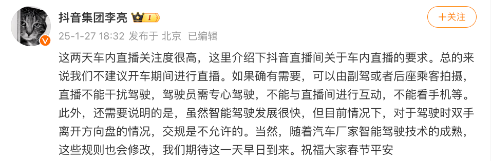 如上图所见,抖音集团副总裁李亮表示:这两天车内直播关注度很高,这里介绍下抖音直播间关于车内直播的要求。总的来说我们不建议开车期间进行直播。如果确有需要,可以由副驾或者后座乘客拍摄,直播不能干扰驾驶,驾驶员需专心驾驶,不能与直播间进行互动,不能看手机等。此外,还需要说明的是,虽然智能驾驶发展很快,但目前情况下,对于驾驶时双手离开方向盘的情况,交规是不允许的。当然,随着汽车厂家智能驾驶技术的成熟,这些规则也会修改,我们期待这一天早日到来。祝福大家春节平安。