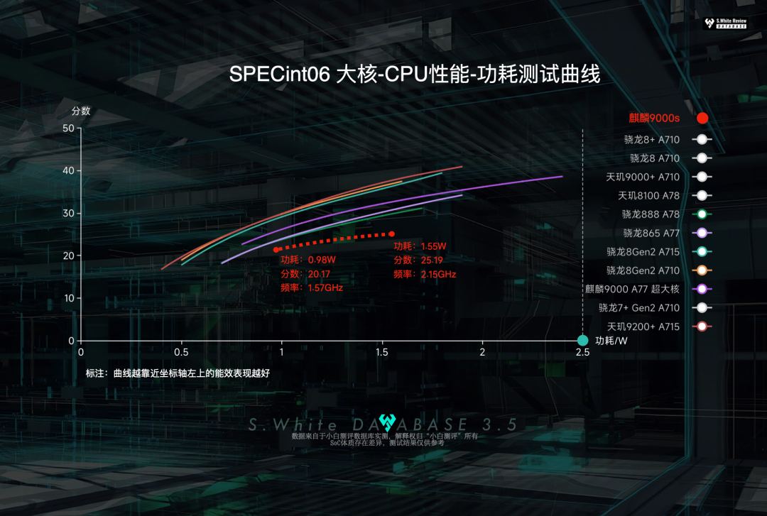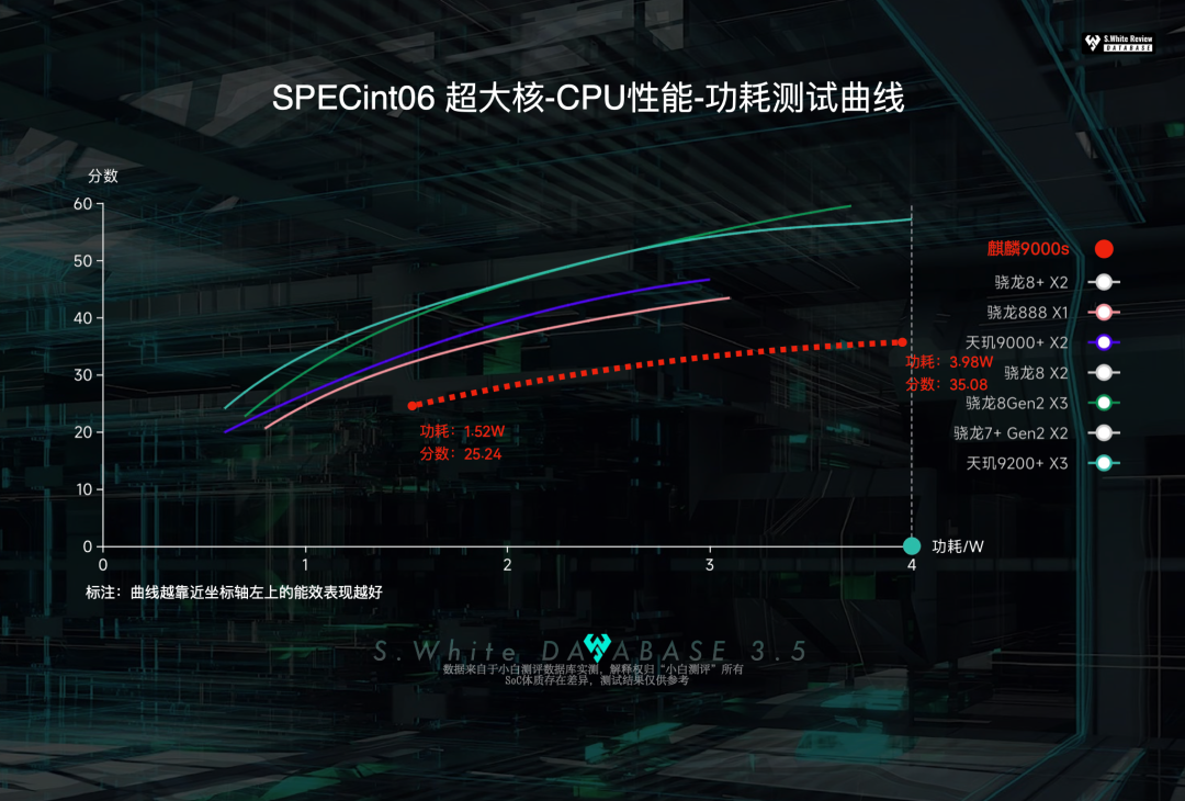 CPU方面,SPEC CPU 2006 整数测试,2.62Ghz超大核得分35.08分,功耗3.98W。降频后得分25.24分,功耗1.52W,在该功耗下,8Gen2的X3得分约为40分,能效领先9000s约60%。