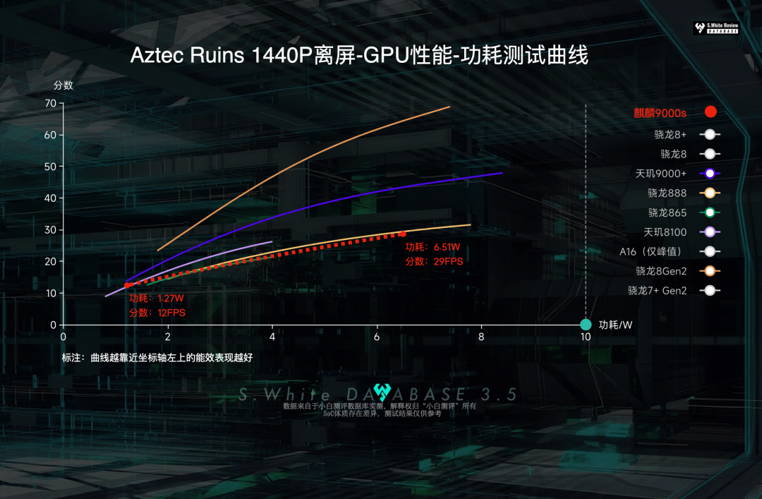 而在1440P Aztec 测试中,308Mhz下的低频能效就要略弱于天玑9000+了。综上,麒麟9000s CPU能效略弱,不如骁龙865和骁龙888以及麒麟9000;已测的GPU两个点的能效和骁龙888和麒麟9000几乎一致。
