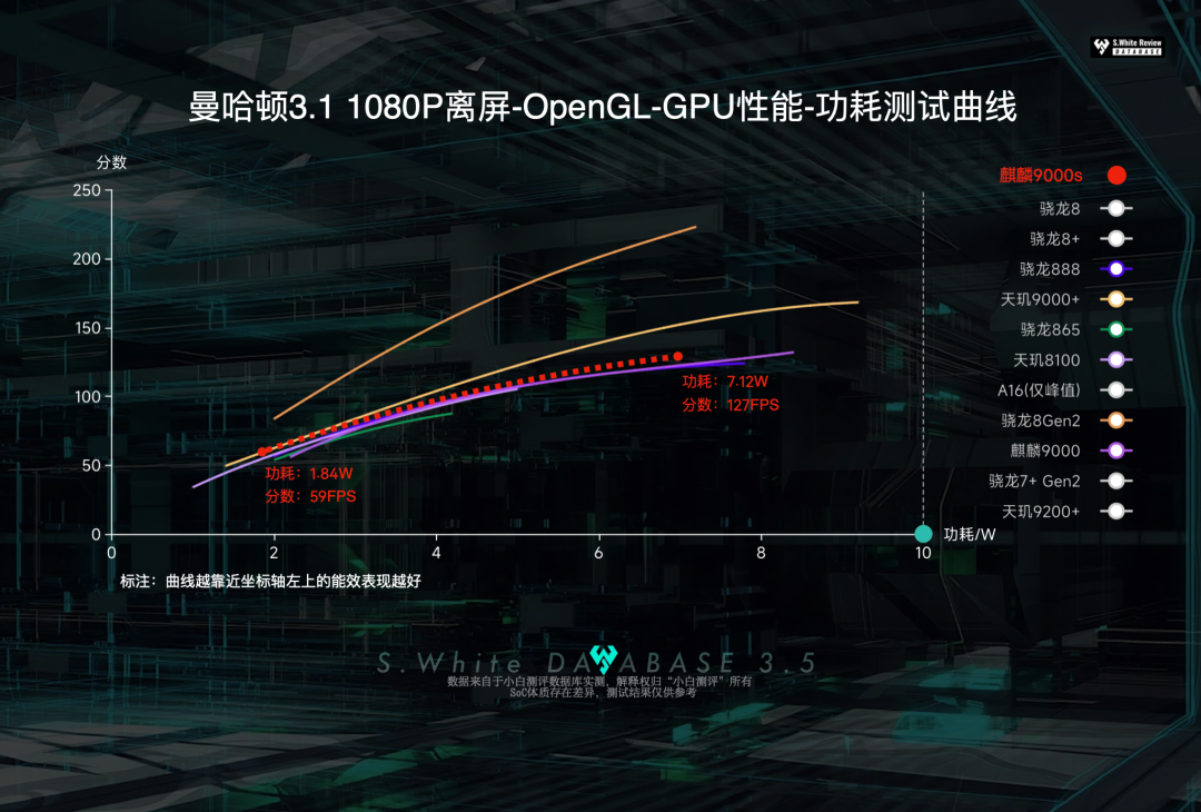 GPU方面,1080P曼哈顿3.1离屏测试,麒麟9000s的Maleoon910 GPU跑到了127fps,功耗7.12W。能效、性能和骁龙888以及麒麟9000相当。降到308Mhz后跑到了59fps,功耗1.84W,该功耗下,和天玑9000+低频能效几乎一致,表现非常不错。