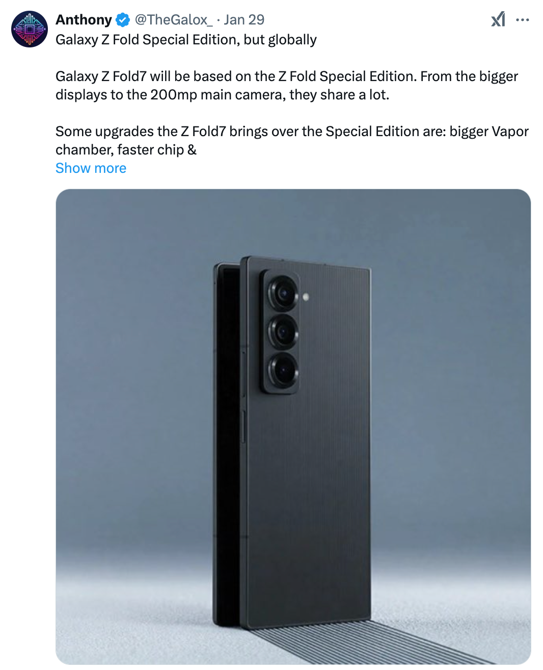 据爆料达人TheGalox_透露:三星即将推出的Galaxy Z Fold7将基于三星去年在韩国推出的Galaxy Z Fold特别版(Galaxy Z Fold Special Edition)机型打造,主要升级点在于拥有更大的VC均热板、更新SoC、升级扬声器组件。