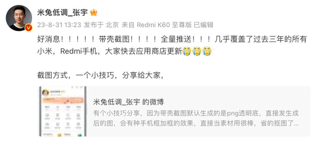 近日,Redmi手机市场经理张宇在微博宣布「带壳截图」功能全量推送。