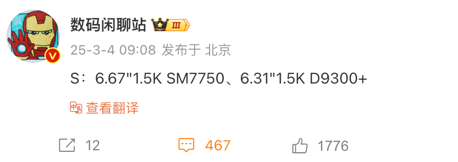 如上图所见,爆料达人数码闲聊站暗示某厂商的S新机将带来两款型号,一款采用6.67英寸的1.5K屏、搭载骁龙SM7750(预计对应骁龙7Gen4),另一款则采用6.31英寸1.5K屏、搭载联发科天玑9300+处理器。结合之前消息,这两款新机或为vivo S21系列,其中6.31英寸小直屏预计为S21 mini(以上S21均为暂时性称呼,最终以发布为准)。