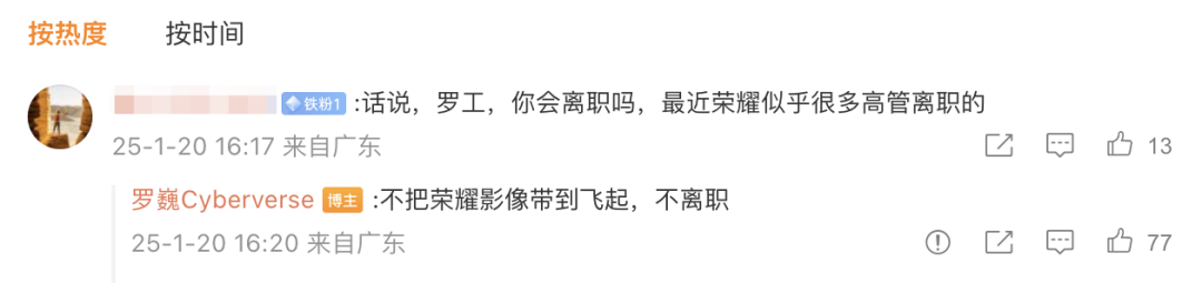 另外昨日下午,荣耀首席影像工程师罗巍在微博上被网友问及是否会离职的话题,称“不把荣耀影像带到飞起,不离职”。大家看好荣耀后续的发展吗?