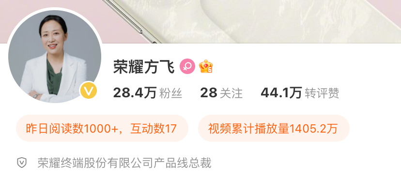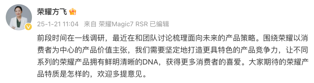 值得注意的是,由于此前出现在公开发布会场合的荣耀高管不多,荣耀终端股份有限公司产品线总裁方飞是其中一位,所以还有网友猜测方飞是否会离职,今日方飞更新微博:「前段时间在一线调研,最近在和团队讨论梳理面向未来的产品策略。围绕荣耀以消费者为中心的产品价值主张,我们需要坚定地打造更具特色的产品竞争力,让不同系列的荣耀产品拥有鲜明清晰的DNA,获得更多消费者的喜爱。大家期待的荣耀产品特质是怎样的,欢迎多提意见。 」并在评论区和网友交流记录反馈。