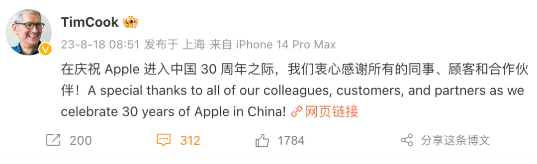 如上图所见,库克表示「在庆祝 Apple 进入中国 30 周年之际,衷心感谢所有的同事、顾客和合作伙伴!」而苹果官网也更新了相关新闻稿,介绍了苹果这些年的动态。