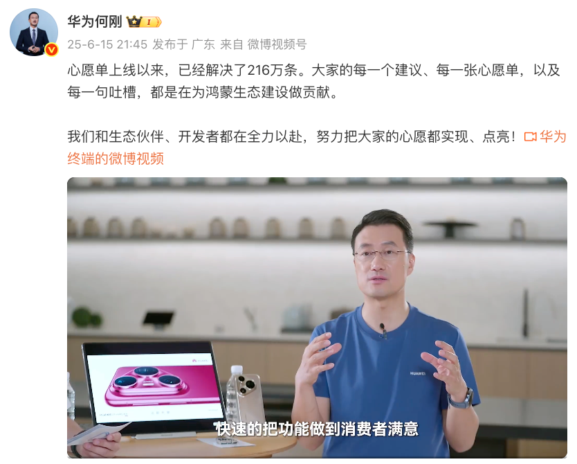 华为何刚则表示:在过去的这一段时间里,华为和合作伙伴一直在努力,在鸿蒙5.0和鸿蒙5.1上已经做了大量的工作,让消费者的体验达到了基本满意。无论是微信也好、抖音也好,或者包括京东、头条很多应用都在不断的努力,快速地把功能做到消费者满意,也有看到消费者的反馈,实况窗已经接入了上百个应用。