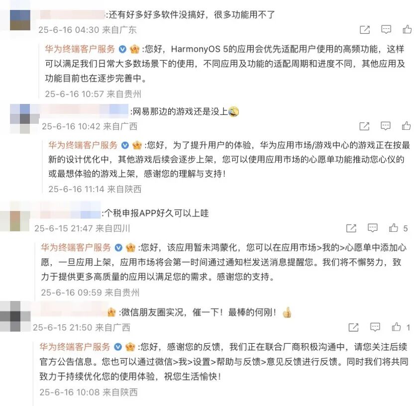 这条微博评论区也有不少用户留言,比如询问某某XX什么时候上,官方表示可以在应用市场-我的-心愿单添加心愿,一旦上架会第一时间通知;另外华为游戏中心的游戏正在按照最新的设计优化中, 其它游戏后续会逐步上架。至于微信朋友圈实况功能,目前正在联合厂商积极沟通中。正在用鸿蒙5的有用户也可以评论区留下你的体验感受~