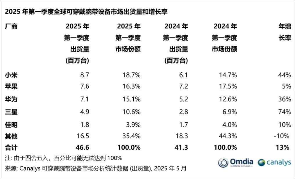 2025Q1中国大陆可穿戴腕带设备出货量TOP5依次是:❶华为,约36%份额,同比+25%;❷小米,约32%份额,同比+94%;❸小天才,约7%份额,同比+11%;❹苹果,约5%份额,同比+15%;❺荣耀,约2%份额,同比+29%。