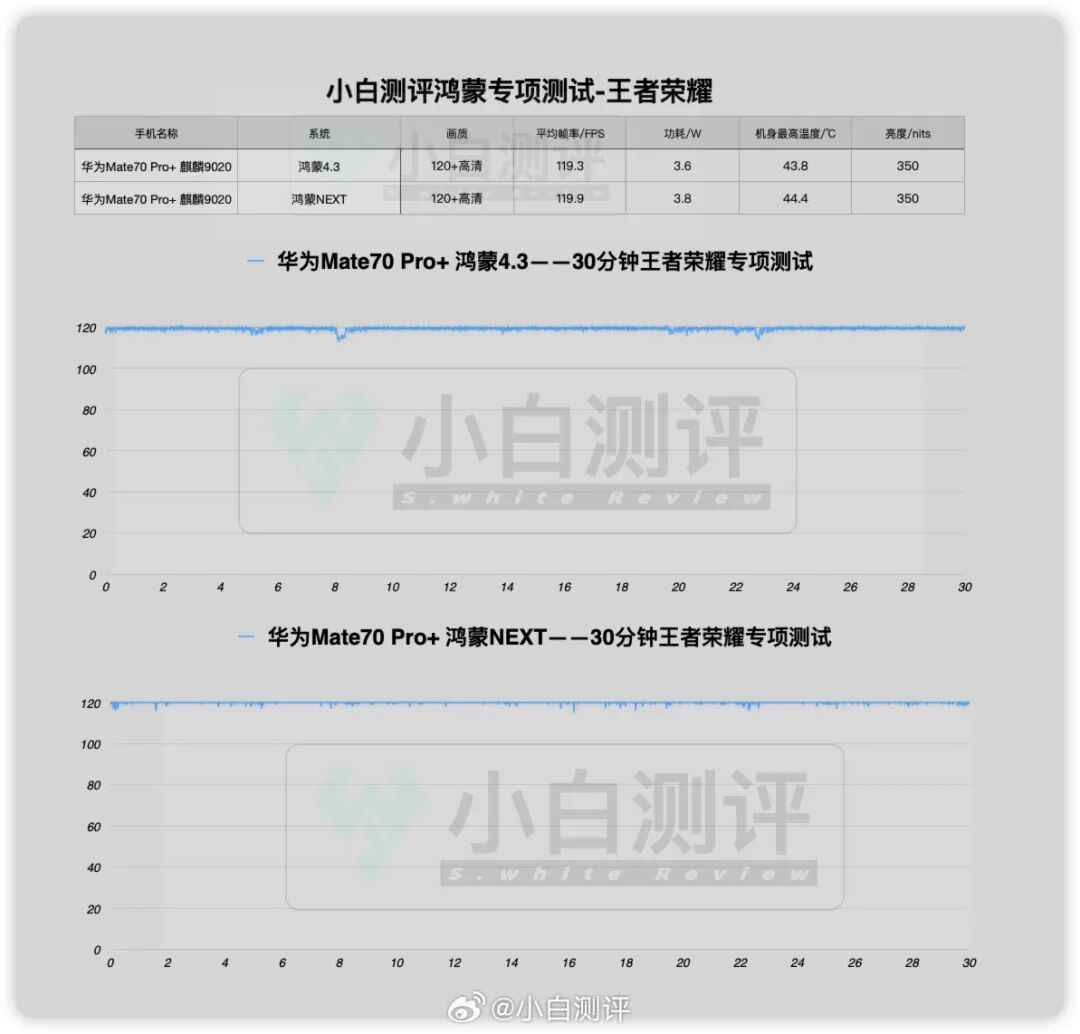 如上图所见,同样实测30分钟《王者荣耀》,鸿蒙NEXT版本下帧率要比4.3版本更稳一点点,不过功耗和温度也有所增加。随着正式上线预计官方后续应该也会进一步优化。