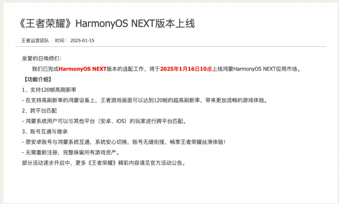 作为补充,官方表示:王者荣耀鸿蒙原生版支持120帧高刷新率、跨平台匹配、原安卓账号与鸿蒙系统互通,系统可安心切换,账号无缝衔接;无需重新注册,完整保留所有游戏资产。有已经开玩的吗?