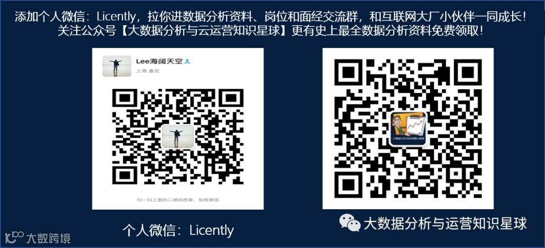 关注公众号【数据分析星球】,持续更新数据分析思维和工具干货内容,公众号后台对话框回复关键词“数据分析”,更有史上最全数据分析资料包免费领取。添加个人微信“Licently”,和更多小伙伴交流数据分析资料、岗位和面经!