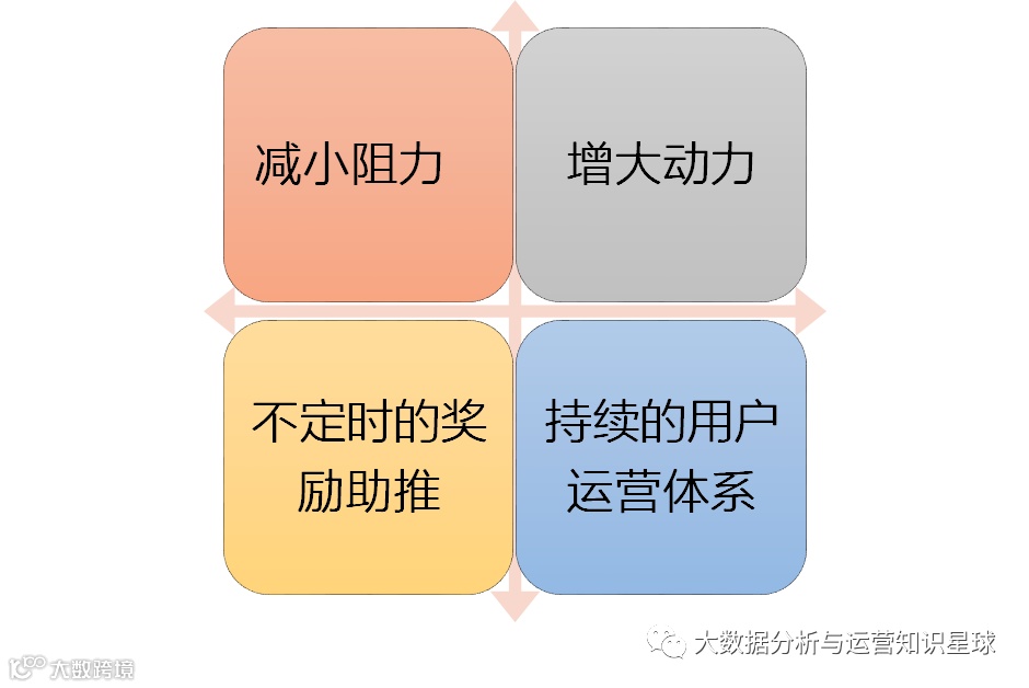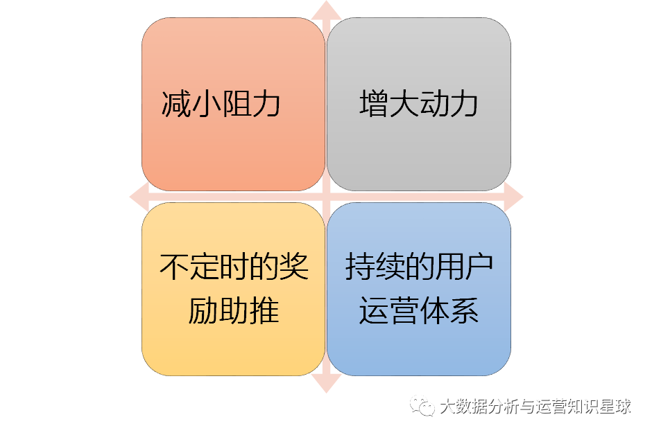 前面已经通过分析了影响新用户留存的关键行为及魔法数字,也分析了用户在达成这个关键行为中的漏斗,知道了新用户最可能在哪一个环节流失,对这些了然于胸后,我们就可以针对性的制定方案,提升新用户的留存了。我们可以从增大动力、减小阻力、增加用户沉没成本和不定时的奖励助推等方面下手。