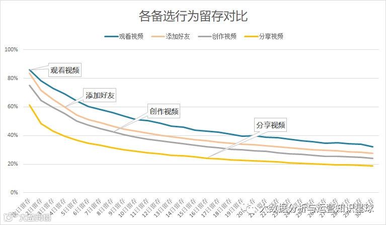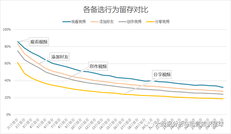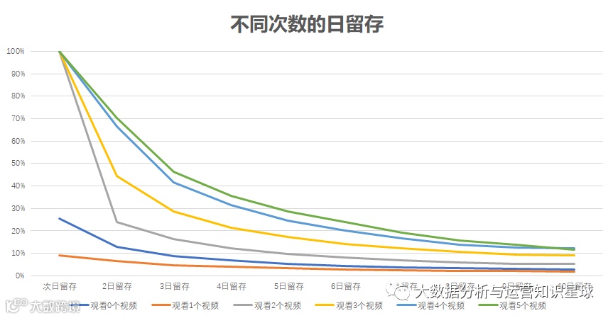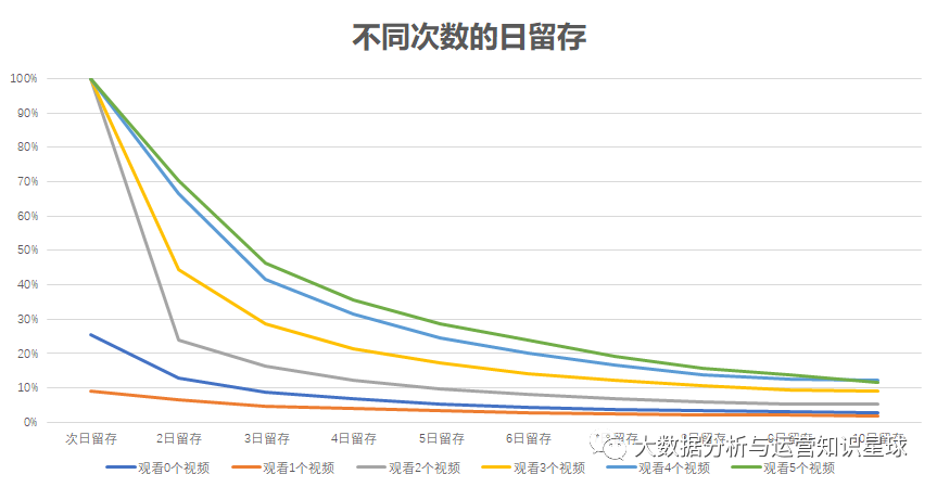 同样以上述短视频APP为例,关键行为完成不同次数的留存率如下如所示,可以发现随着观看视频次数的增加,新用户留存在明显提升,但是观看次数大于5次时,用户留存提升的不是很明显,已达增长边际,所以可以确定5即为魔法数字。