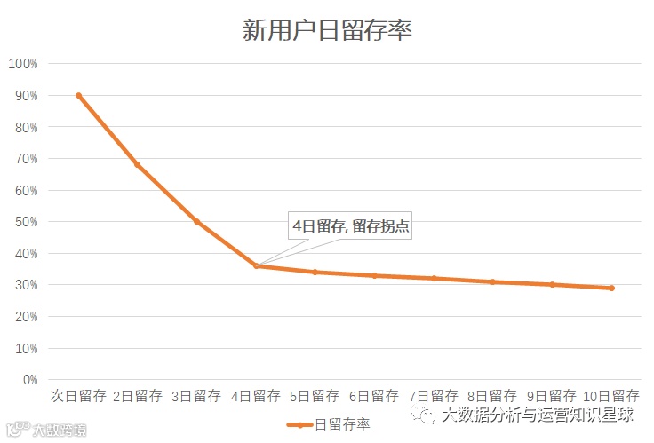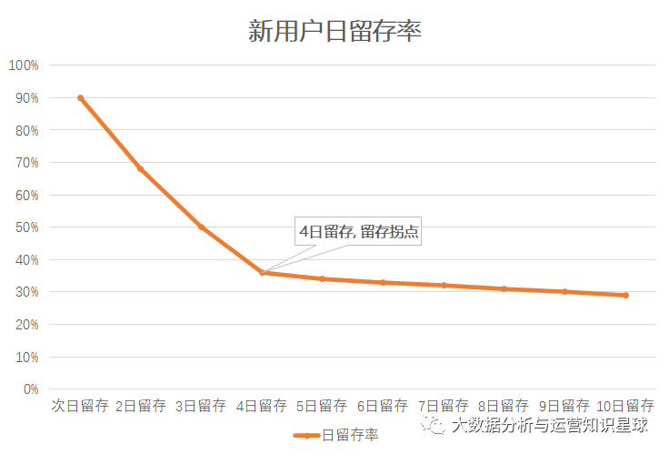 基于这几个原则确定新用户决策期:通过整体留存曲线,找到留存拐点,这个拐点就是决策期,这个决定了关键行为要在这个期限内发生,如下图,4日后新用户留存已基本稳定,流失大量发生在4日以内,所以关键行为最晚要在新用户注册4天内发生。