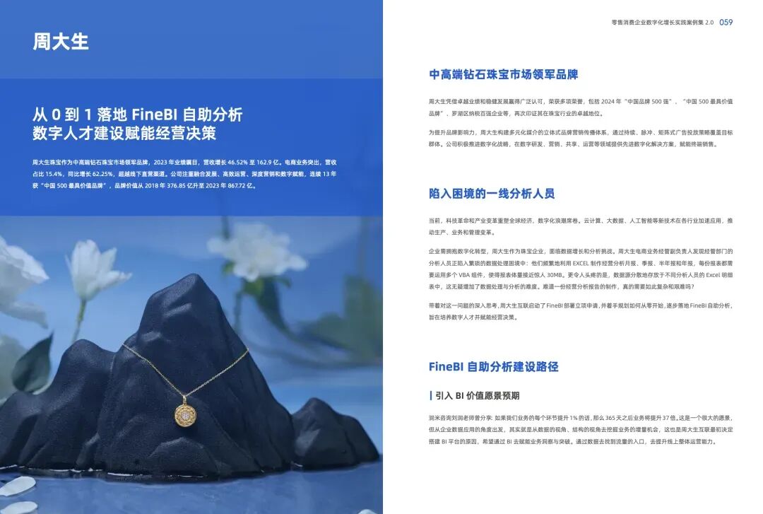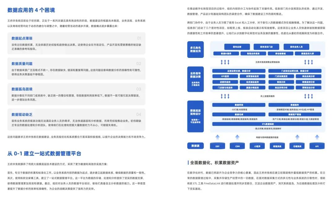 此次,帆软推出《零售消费企业数字化增长实践》案例集2.0,分享波司登、薇美姿、周大生、潮宏基、维维股份、恒安集团、云鲸、交个朋友、碧生源、足力健、周黑鸭、王府井等众多先进企业的数字化实战案例,致力于与更多消费零售企业一起,实现业务变革与增长!