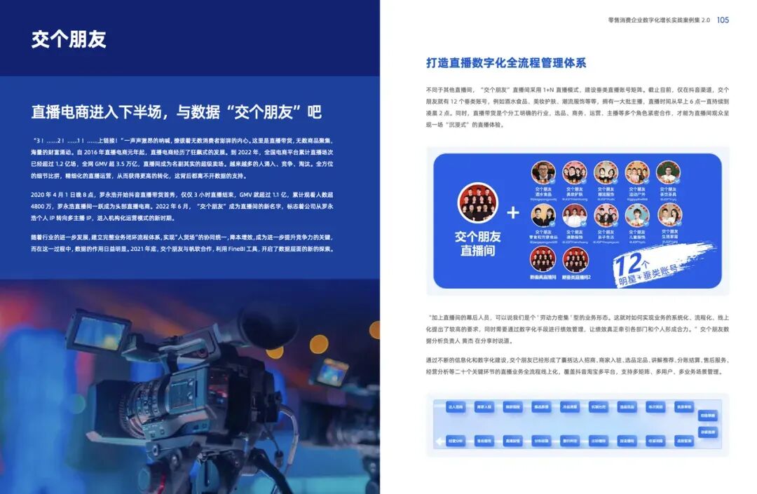 将达人招商、商家入驻、选品定品、讲解推荐、分账结算、售后服务、经营分析等二十个直播业务关键环节全流程线上化,覆盖抖音、淘宝等多个平台。