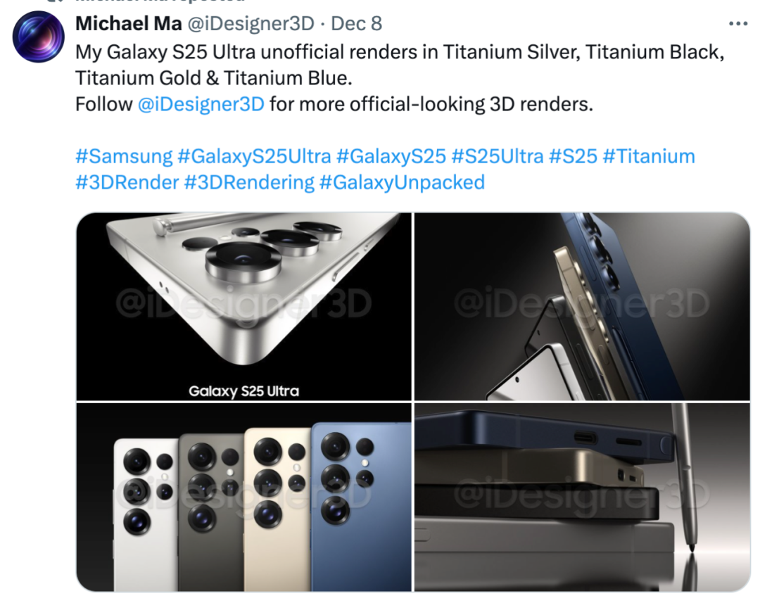 如上图所见,海外博主@iDesigner3D 在社交平台上分享了三星S25 Ultra的外观渲染图(非官方),称主打色有钛银色、钛黑色、钛金色、钛蓝色4个,整体依然是方正硬朗机身,直角中框,配备S Pen。