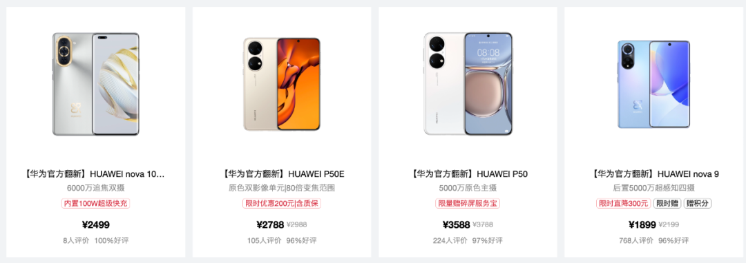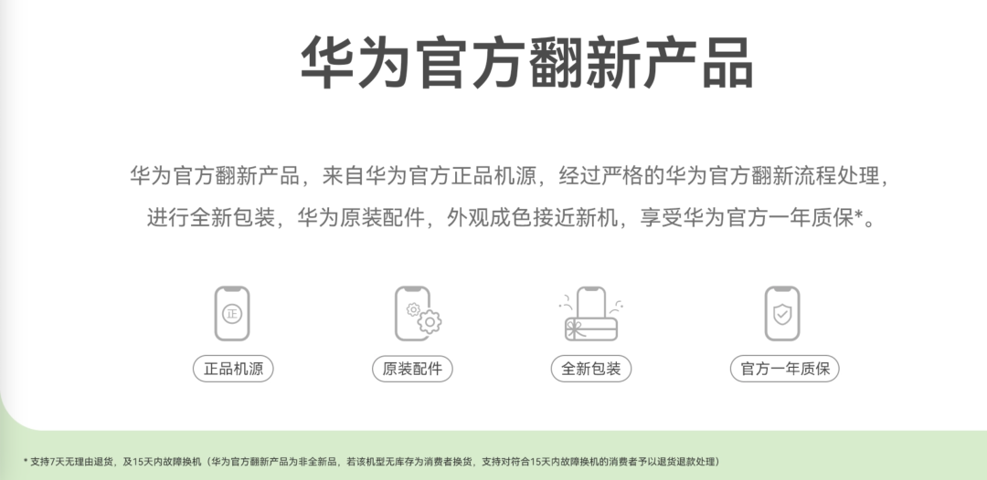 相关页面显示,华为官方翻新产品来自华为官方正品机源,经过严格的华为官方翻新流程处理,包含华为原装配件,进行全新包装,外观成色接近新机,可享受华为官方一年质保(7天无理由退货、15天内故障换机)等。