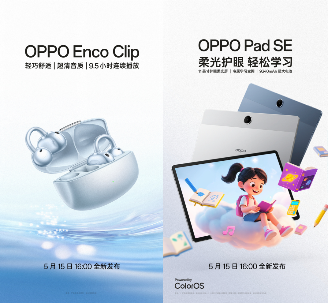如上图所见,5月15日当天还将发布OPPO首款耳夹式耳机Enco Clip以及一款平板新品Pad SE。具体OPPO Pad SE主打11英寸柔光屏、9340mAh电池、专属学习空间,猜测定位比较入门。