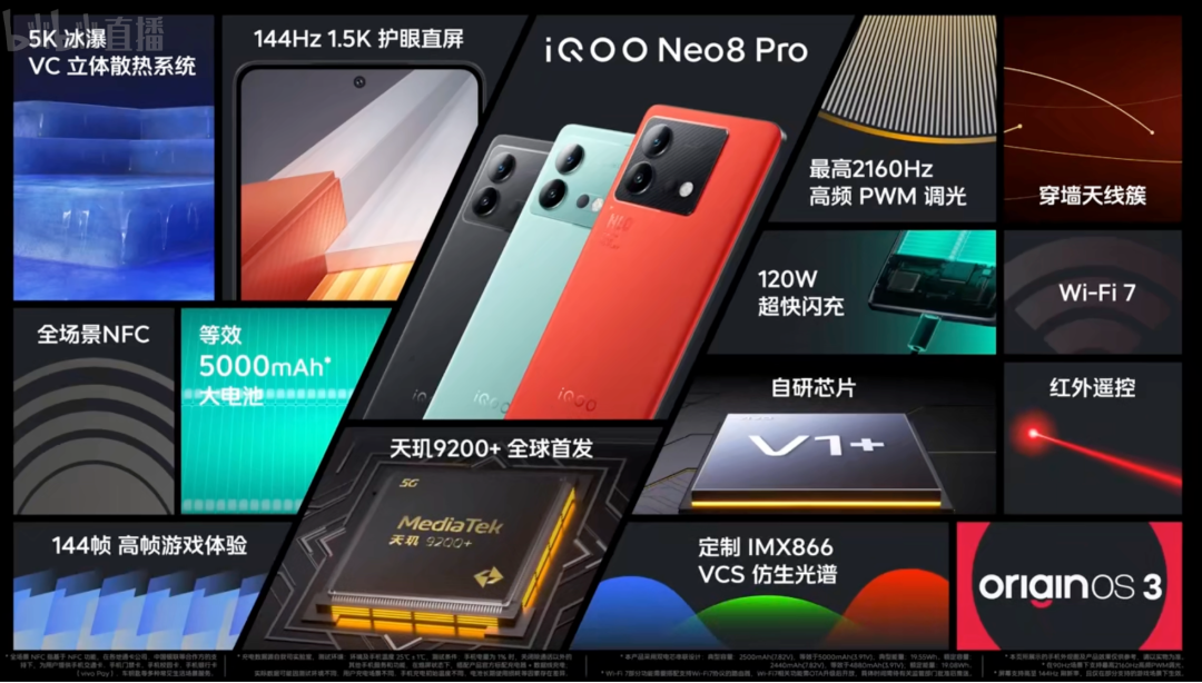 核心配置上,iQOO Neo8 Pro前置16MP,后置50MP 索尼IMX866V有OIS+8MP超广角;首发搭载联发科天玑9200+处理器,LPDDR5x、UFS4.0,自研芯片V1+,5000mAh电池,120W充电,支持NFC、红外遥控,双频GPS,屏下双控压感,封闭式立体双扬,双X轴线性马达,运行基于Android 13的OriginOS 3。