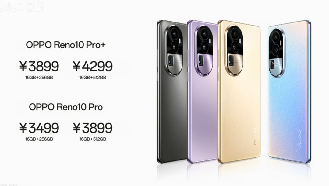 价格上,【OPPO Reno10 Pro+】16+256GB起步 售价3899元,16+512GB版售价4299元,目前已开启预订,将于6月1日开售。应该是2023截至目前发布的手机中最便宜的配备潜望长焦的手机。