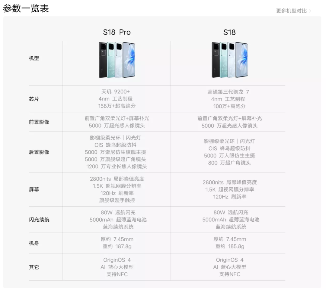 【vivo S18 Pro】6.78英寸2800*1260分辨率的居中单挖孔AMOLED曲屏,120Hz刷新率,短焦屏下指纹,塑料中框,机身厚约7.45mm,重约187.8g,提供花似锦、青澈、玄黑3个配色,前置50MP超光感人像镜头,后置三摄50MP主摄有OIS+50MP超广角+12MP长焦人像,搭载天玑9200+处理器,LPDDR5X、UFS 3.1,5000mAh电池,80W充电,支持NFC,预装OriginOS4,支持AI蓝心大模型。
