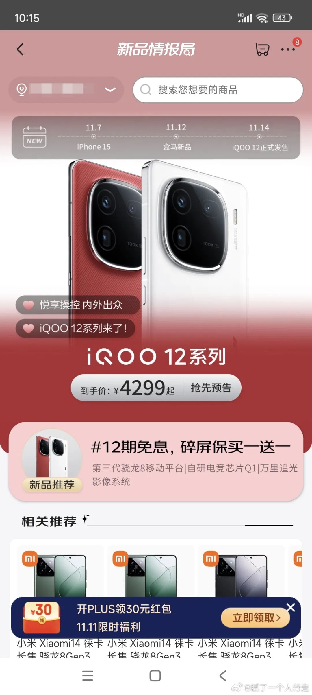 相关界面显示iQOO 12系列4299元起,4299预计对应起步版本的价格,个人预估应该是12+256GB版本起步,和小米14同版本(12+256GB 4299元)同价。