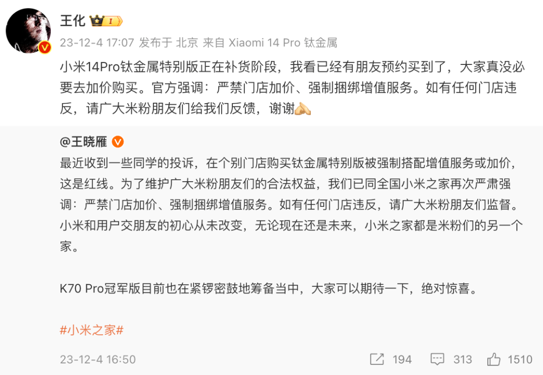 值得注意的是,昨天下午小米集团副总裁、中国区总裁王晓雁在微博表示:“最近收到一些同学的投诉,在个别门店购买钛金属特别版被强制搭配增值服务或加价,这是红线。为了维护广大米粉朋友们的合法权益,我们已同全国小米之家再次严肃强调:严禁门店加价、强制捆绑增值服务。如有任何门店违反,请广大米粉朋友们监督。K70 Pro冠军版目前也在紧锣密鼓地筹备当中,大家可以期待一下,绝对惊喜。”真心想入手钛金属的或许可以试试问问线下。
