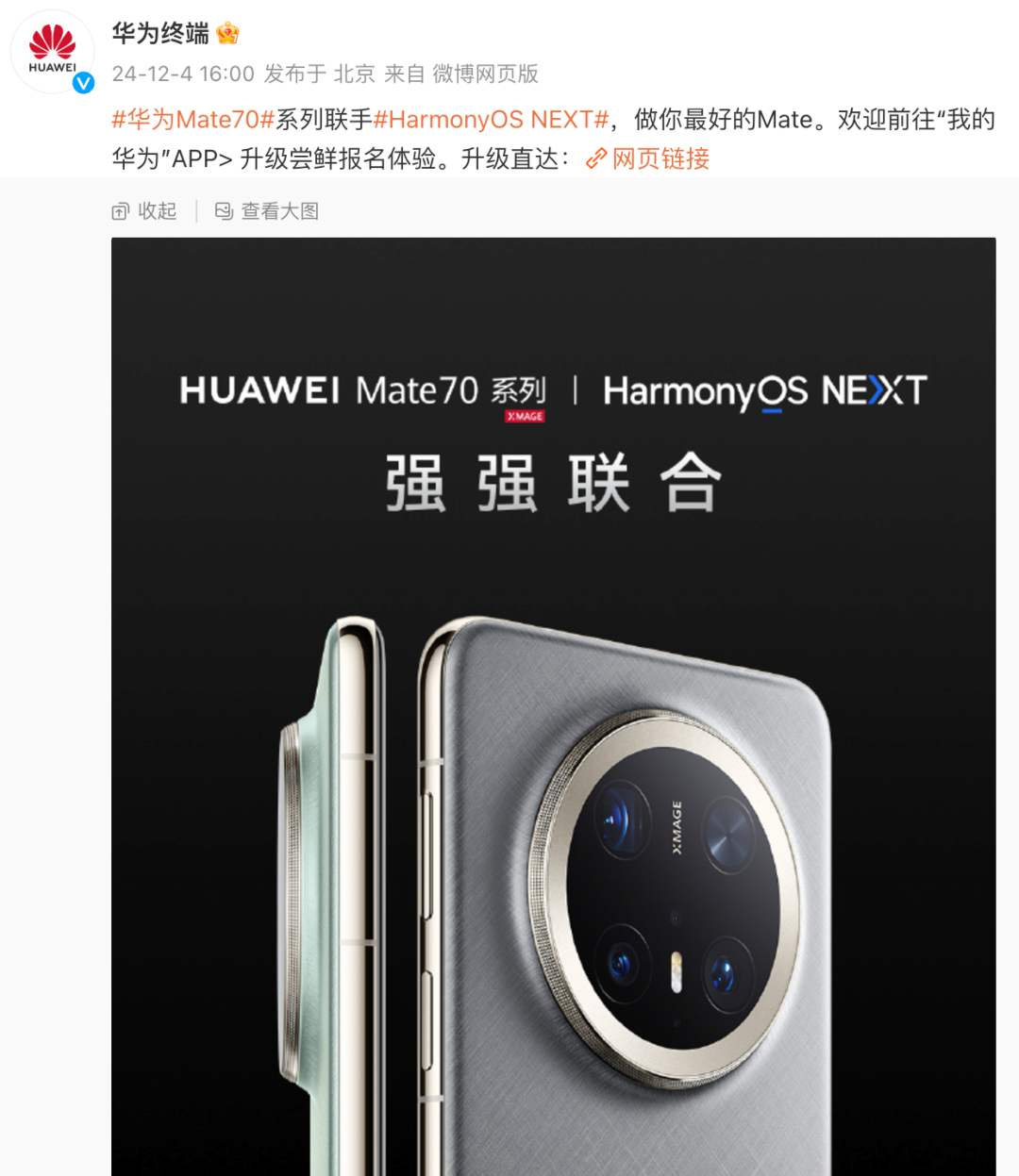 细节上,早前发布会上余承东曾表示华为Mate 70系列和Mate X6到手可升级鸿蒙NEXT,在华为商城抢购Mate 70 Pro时,还可以选择“鸿蒙NEXT先锋版”,今天官方微博也更新了报名方式,已经用上鸿蒙4.3版本的Mate 70系列用户可以自行考虑是否升级。