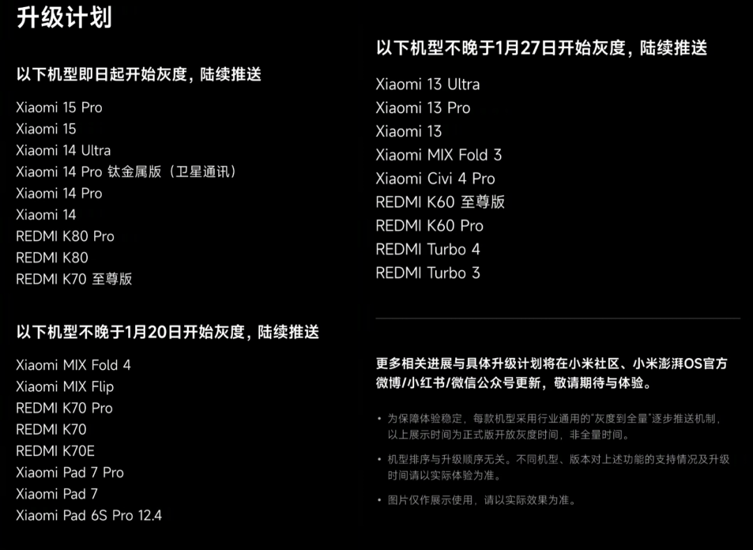 具体升级计划参考上图,小米15系列、小米14系列、红米K80系列、K70至尊版即日起开启灰度/陆续推送,小米MIX Fold4/Flip、红米K70/Pro/K70E、小米平板7系列、Pad 6s Pro 12.4不晚于1月20日开始灰度,小米13系列、MIX Fold3、Civi4 Pro、红米K60 Pro/至尊版、Turbo4(暂未发布)、Turbo3则不晚于1月27日开始灰度。由于是灰度到全量机制、展示时间为开放的灰度时间,并非全量推送时间,所以相关用户大批量用上应该还需要一定时间。