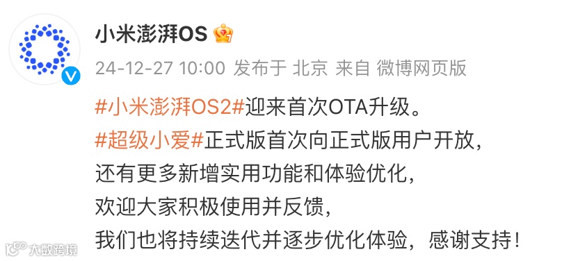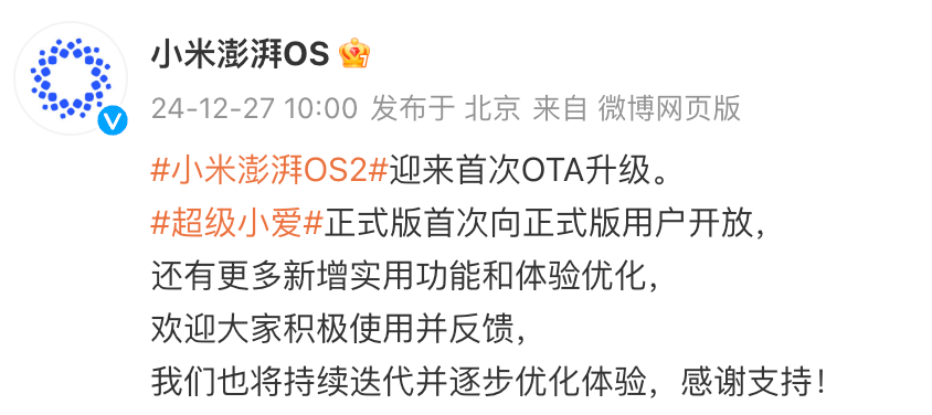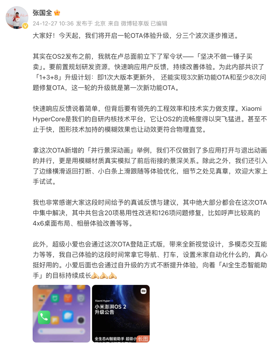 作为补充,小米手机系统软件部总监张国全还在微博表示:“在OS2发布之前,就在卢总面前立下了军令状——「坚决不做一锤子买卖」。要前置规划研发资源,快速响应用户反馈,持续改善体验。为此内部共识了「1+3+8」升级计划:即1次大版本更新外, 还能实现3次新功能OTA和至少8次问题修复OTA,这一轮的升级就是第一次新功能OTA。”已经收到的小伙伴可以现在评论区分享下初步体验~