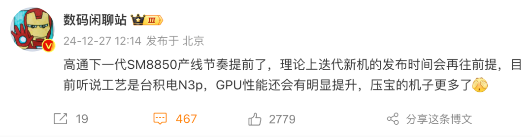 爆料达人数码闲聊站透露:「高通下一代SM8850产线节奏提前,理论上迭代新机的发布时间会再往前提,目前听说工艺是台积电N3P,GPU性能还会有明显提升,压宝的机子更多了。」